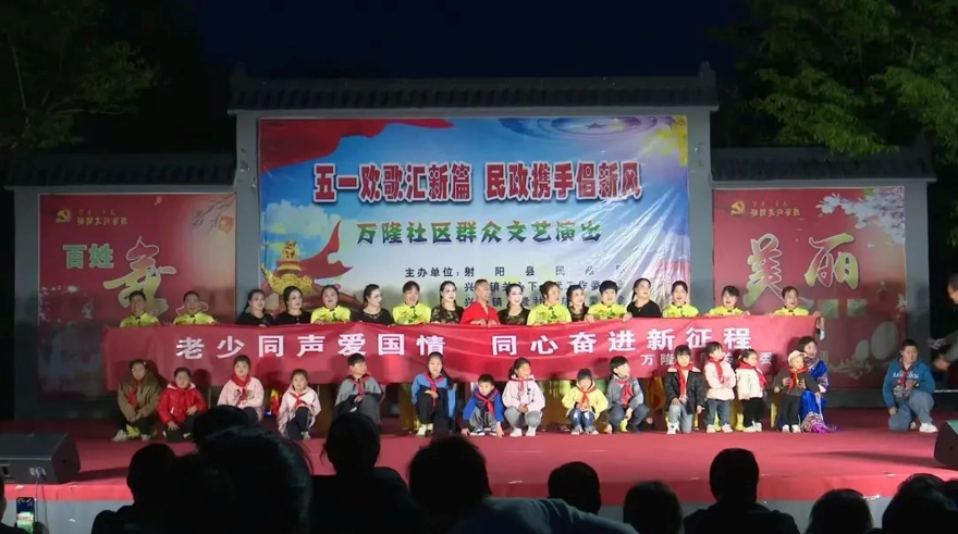 4月30日晚,由盐城市射阳县民政局主办,兴桥镇关工委、万隆社区承办的“老少同声爱祖国,齐心奋进新征程”为主题的文娱汇演活动在万隆社区百姓大舞台举行。县民政局领导、县关工委领导、镇关工委全体成员、中小学生、社区居民等600多人欣赏了节目,大家在一起共同度过了一个愉快的夜晚。