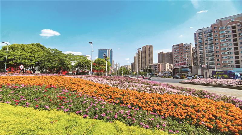目前,锡城各色花卉开得正艳,成片的花海将道路点缀得如梦如幻,一路繁花一路景,赏心悦目,美不胜收。图为太湖大道和长江北路口的美景。(宗晓东 摄)