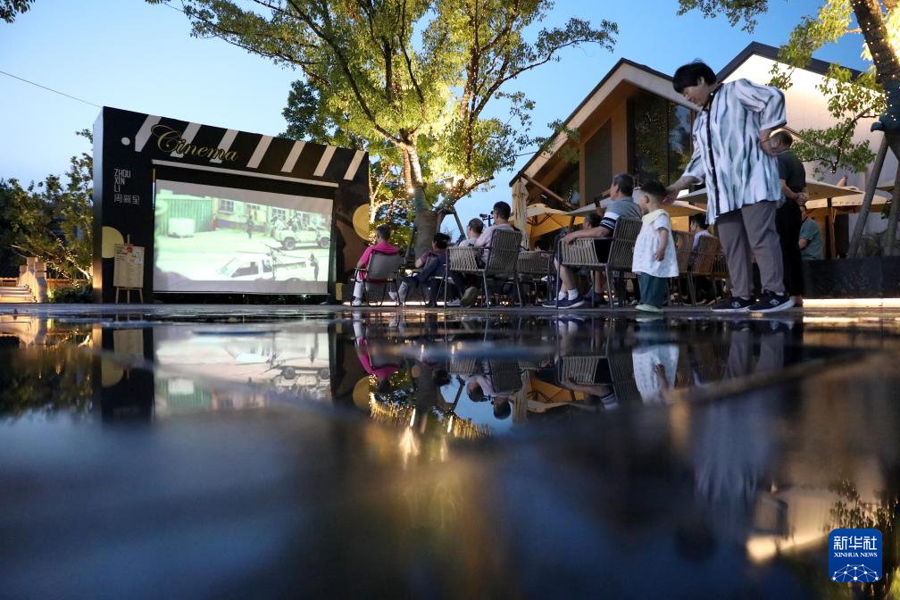 5月21日,市民在江苏省无锡市周新里街区观看露天电影。