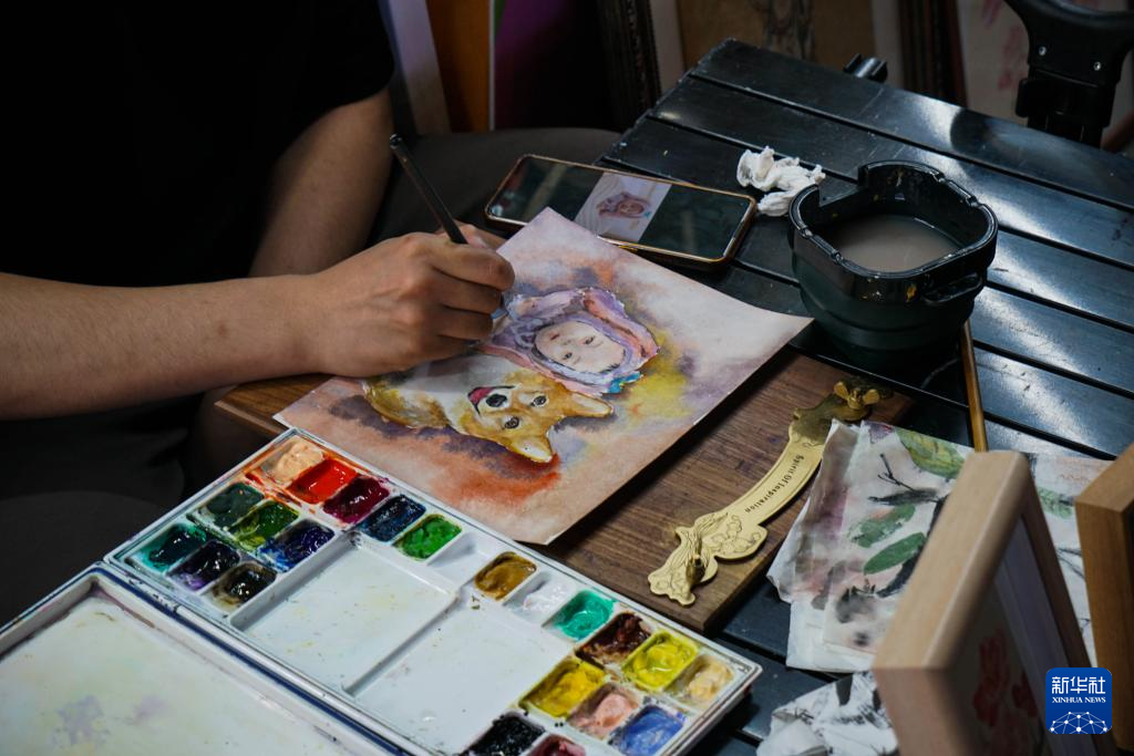 5月21日,市民在江苏省无锡市湖滨商业街画画。