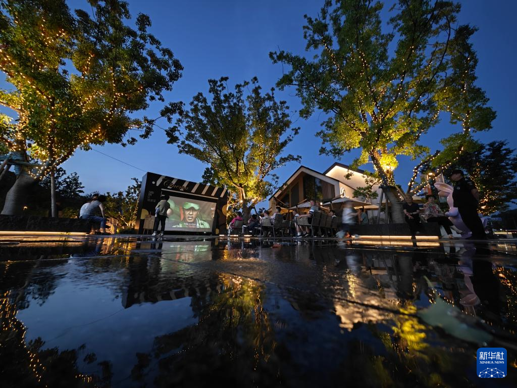 5月21日,市民在江苏省无锡市周新里街区看露天电影。