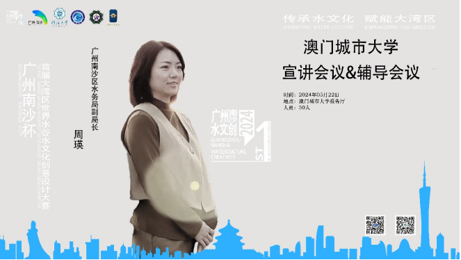 王冠为参加本次活动的澳门高校师生介绍了本次水文创大赛的赛道设置,共分“水传播设计”“水经济艺术新星”“水科普装置”“水文旅场景”和“水驿站科普”五个专项赛道,以广州市南沙区为实践地,以世界水谷文创品牌赛事为平台,以“水上南沙——我心中的大湾区”为主题,希望澳门高校师生能够踊跃参与。