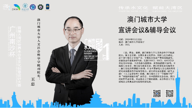 5月22日下午,“广州南沙杯”——首届大湾区世界水谷水文创大赛大湾区第三场宣讲会议&辅导会议在澳门城市大学氹仔校区何贤会议中心举行,专家代表、特邀嘉宾和澳门高校师生50多人参加了本次现场宣讲和辅导活动。