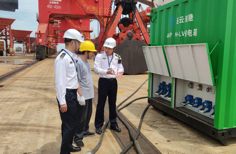 5月27日,在连云港海事局徐圩海事部门执法人员的监督指导下,靠泊在徐圩港区101泊位的“嘉**”轮成功连接码头船舶岸电系统。在港靠泊作业期间,此系统为船舶提供了源源不断的电力供应。