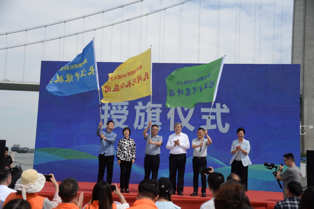启动仪式上,泰州市委统战部常务副部长、一级调研员孙琦,泰州医药高新区党工委委员、高港区委常委、宣传和统战部部长张洁,泰州市水利局副局长、机关党委书记印华健分别为泰州市新的社会阶层人士“民间河长公益团”、医药高新区(高港区)“长江护绿联盟”、泰州市新的社会阶层人士“巡江护河宣讲团”授旗。