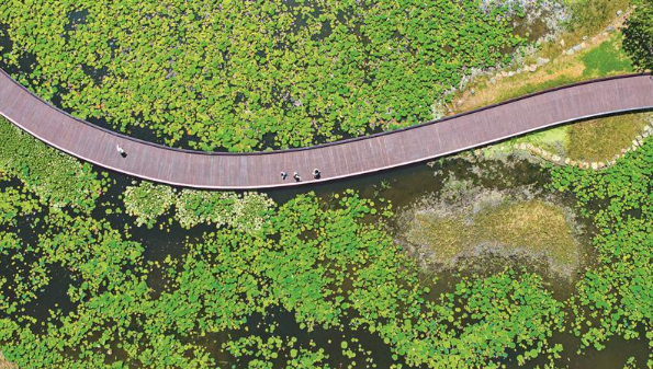 为迎接中国第38届荷花展,管社山庄湿地公园全面开展景观质量提升、功能设施完善工作。近期管社山庄启动了木栈桥翻新亮化、水厂陈列馆整修、游步道整治、绿化景观修剪、公共设施增添、导向标识更新等工程,预计将于6月完工。图为昨天下午,市民正在新修的人行栈道上观赏美景。(宗晓东)