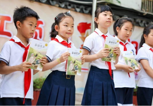 刷刷阿姨给同学代表们授书,大家捧着心爱的《茶园笙声》,脸上露出了幸福的笑容。