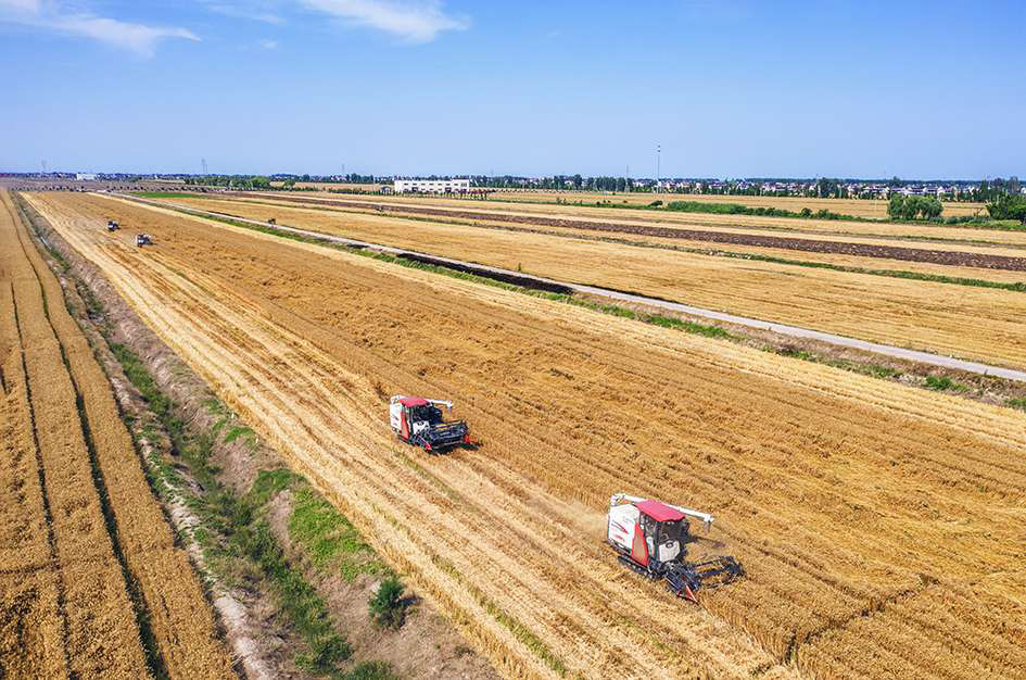 通州万顷良田项目区内的联合收割机正在抢收小麦,确保颗粒归仓。 卑多敏 摄