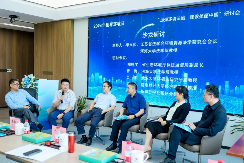 沙龙研讨环节由江苏省法学会环境资源法学研究会会长、河海大学法学院教授李义松主持。省生态环境厅执法监督局副局长陶得奖,河海大学法学院教授晋海,武汉大学环境法研究所副教授吴宇,南京财经大学经济学院副教授周元春,新华日报社扬州分社社长孙劲松围绕“美丽中国建设中的法治责任与担当”主题展开了深入讨论。