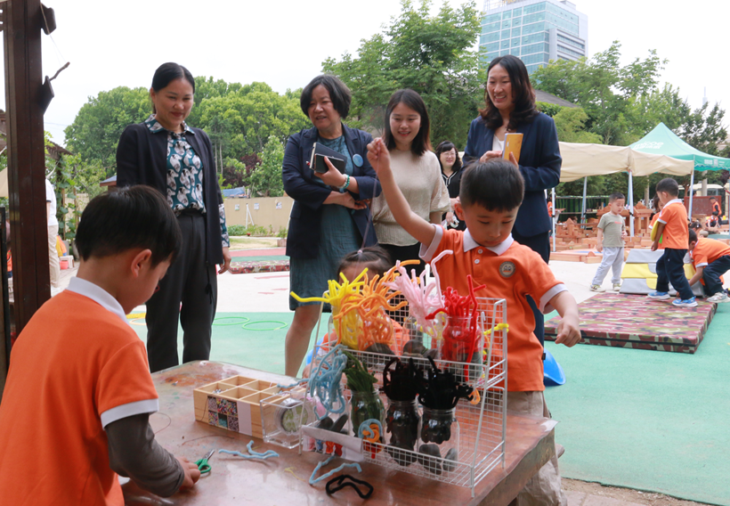 调研专家组从项目建设情况、主要举措、实施成效、反思与设想等方面了解了幼儿园的课程建设情况。调研中专家们全方位查看了幼儿园的室内外环境,走进全域开放的游戏现场,沉浸式观摩了孩子们在室内外的游戏,并与教师、幼儿亲切交流。