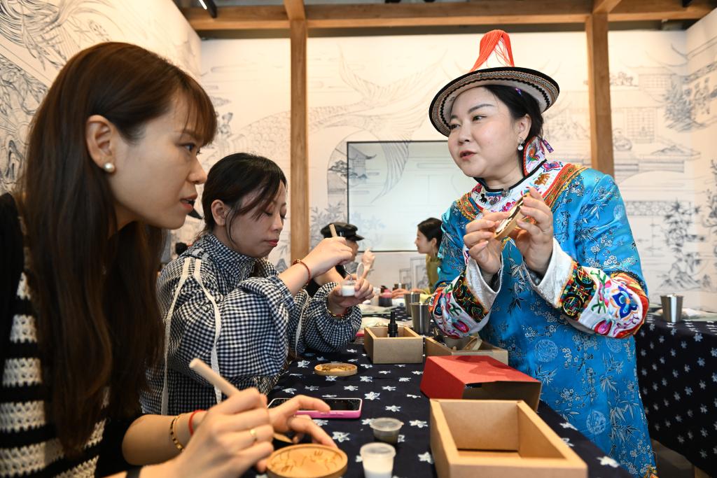 6月7日,掐丝珐琅画艺人姚艳玲指导来宾制作手工艺品。