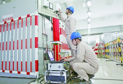 图为6月5日,在位于经开区的文庄110kV变电站内,工作人员正在进行20kV母线分段保护装置调试。(蒋瑜)