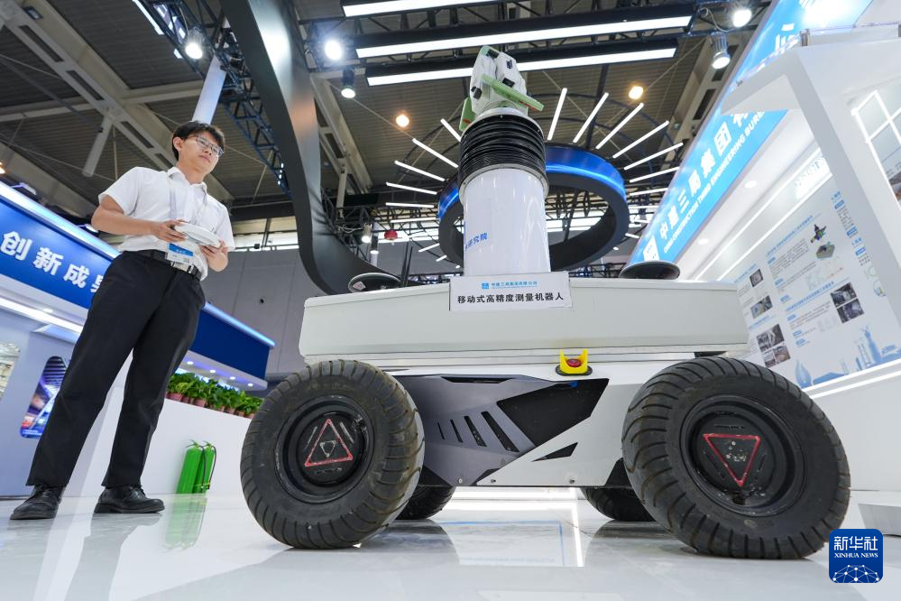 6月13日,在中建三局集团有限公司展区,一名工作人员在操作展示“移动式高精度测量机器人”。