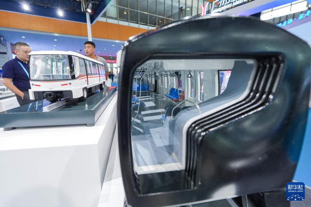 6月13日,观众在阿尔斯通展区参观单轨列车“Monorail 300”模型。
