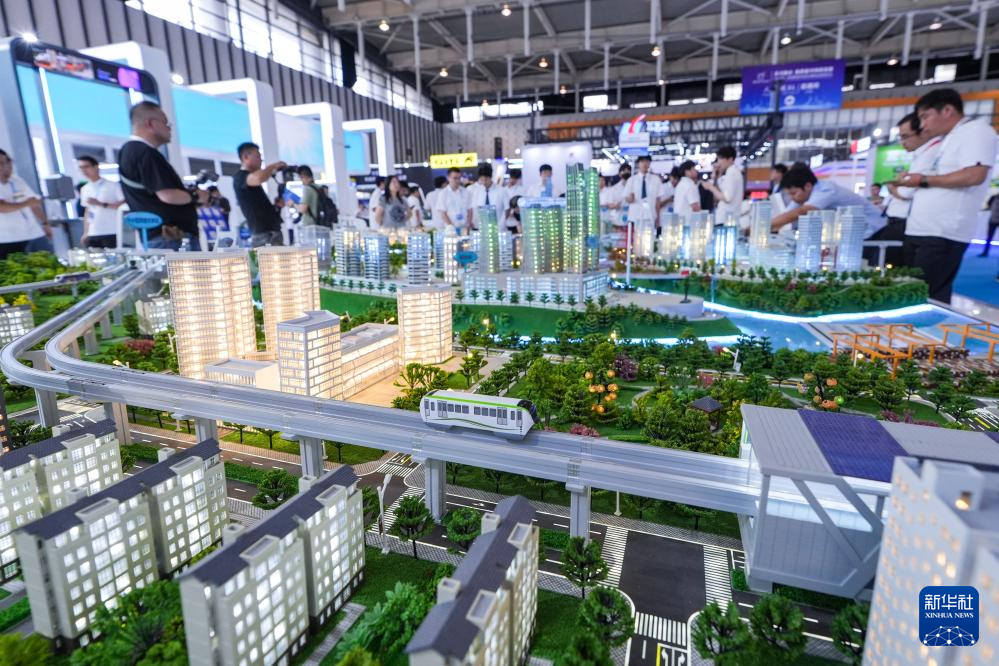 6月13日,观众在中国中车展区参观“悬挂式单轨列车”模型。