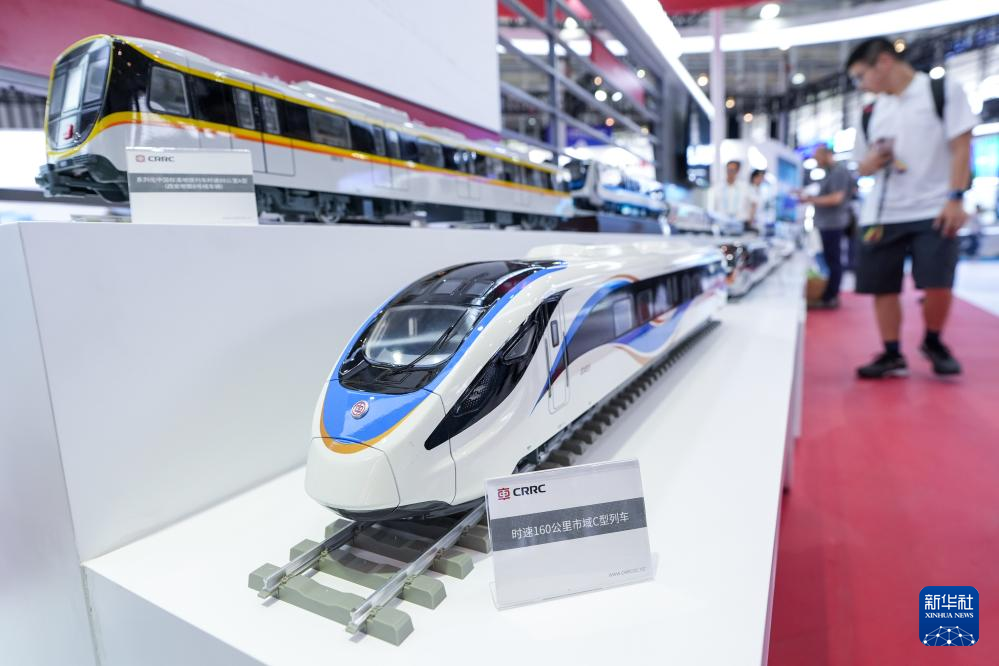 6月13日,观众在中国中车展区参观“时速160公里市域C型列车”模型。