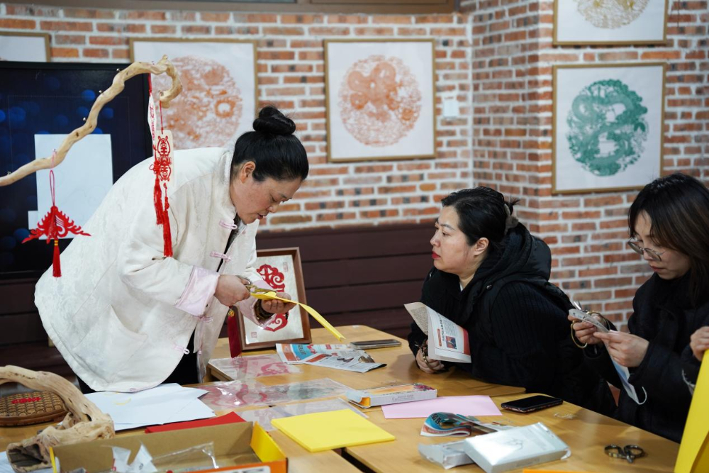 在剪纸课堂上,学员们围坐在一起,享受着专属于自己的夜间时光,宜兴市剪刻纸非遗传承人吕晓敏老师详细讲解关于剪纸的专业知识,带领大家一起动手实操,让大家在实践中感受剪纸的乐趣。