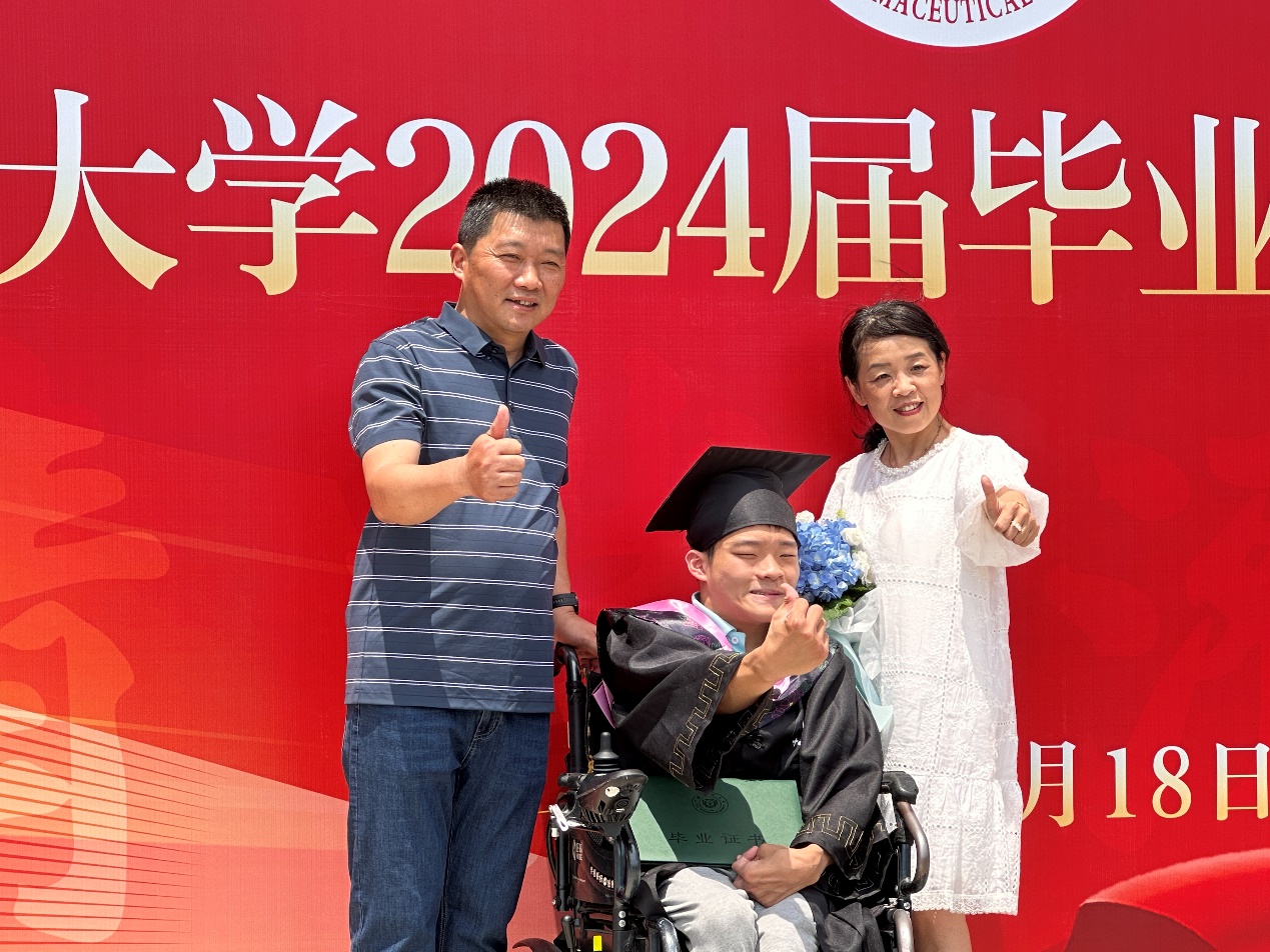 在姚俊鹏心中,在药大的四年里最大的收获是个人的成长。“虽然身体条件限制了我的发展。但并没有影响到我整体的学业。今天是我人生中非常重要的时刻,这意味着一个人生阶段的结束,也是下一个人生阶段的开始。一路上帮助我、默默关心我的人,我都对他们心怀感恩。未来我将继续深造,在学术道路上走得更远,尽己所能回报大家的关心和帮助。”姚俊鹏说。