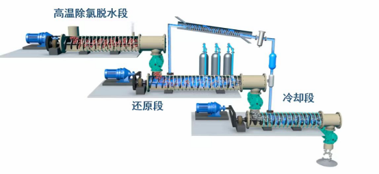 据团队负责人潘文峰介绍,该工艺采用三段式除氯脱水、还原、冷却核心装备,利电偶加热强化热传导,使得还原温度降至650℃,能耗降低30%。利用氢气“低排放”循环利用技术,氢耗降低30%以上且最终反应产物为无污染的水蒸气。经计算,使用两台推舟炉年产600t单质铁,使用直径400mm连续高效氢还原装备与系统,年产量提高至1500t以上,还原效率大幅度提高。