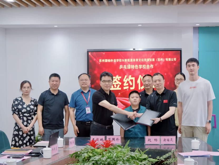 日前,苏州国裕外语学校与新铭晟体育文化传播发展(苏州)有限公司为合作开展“乒乓球特色学校”,共建乒乓球青少年训练基地举行签约仪式,原中国国家青年队、少年队教练赵畅,苏州国裕外语学校校长王俊鹏出席签约仪式。