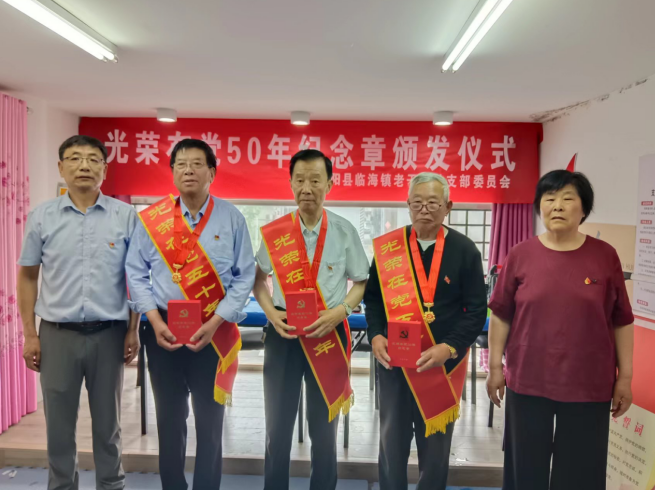 仪式现场气氛热烈,暖意融融,临海镇老干部党总支书记郜古祥、副书记戴秀珍为身披红色绶带的陈德祥、赵胜祥、吴恒成三名老党员颁发“光荣在党50年”纪念章。3名老党员深情回顾入党50年的难忘岁月,畅谈在临海大地上耕耘几十年的工作经历,分享宝贵的工作经验和人生感悟,表达了对临海的满腔热爱和美好祝福。