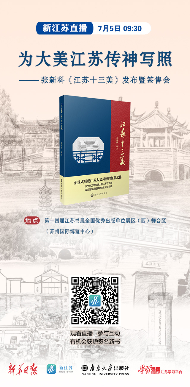 7月5日上午,《江苏十三美》作者张新科将与南京大学教授、六朝博物馆馆长胡阿祥,南京大学教授、《江苏文库·文献编》主编程章灿联袂,以专家对谈形式共话江苏地方文化。本次活动将以线上线下融合形式展开,除专家对谈外,还设有线下读者提问、作者签售与线上讨论、赠书等环节,全面提升读者的参与体验。(陈潇)