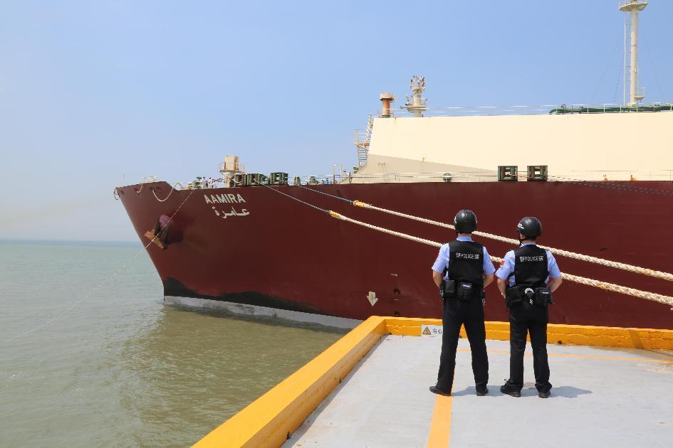7月5日13时,在江苏边检总站如东边检站民警的监护下,装载11.5万余吨液化天然气马绍尔群岛籍“阿米拉”轮缓缓靠泊中石油江苏LNG码头。截至这一船,该站已保障来自俄罗斯、秘鲁、卡塔尔等26个国家和地区的LNG船700艘,助力接卸LNG能源超5800万吨。