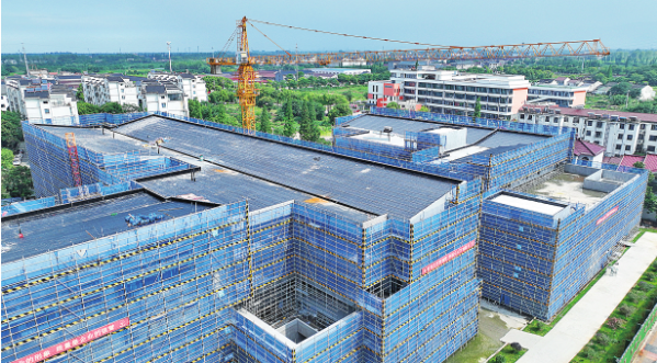 眼下,位于丁蜀镇的市东坡中学新建工程主体结构已完工,目前正在进行室内外装修装饰作业。该工程于去年8月中旬开工,建筑总面积近3万平方米,总投资超1.5亿元,预计将于今年年底竣工验收。图为工程建设现场。