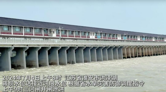 7月4日上午8时,江苏省淮安市洪泽湖蒋坝水位达接近汛限水位,根据省水旱灾害防御调度指令,上午9时三河闸开闸泄洪。