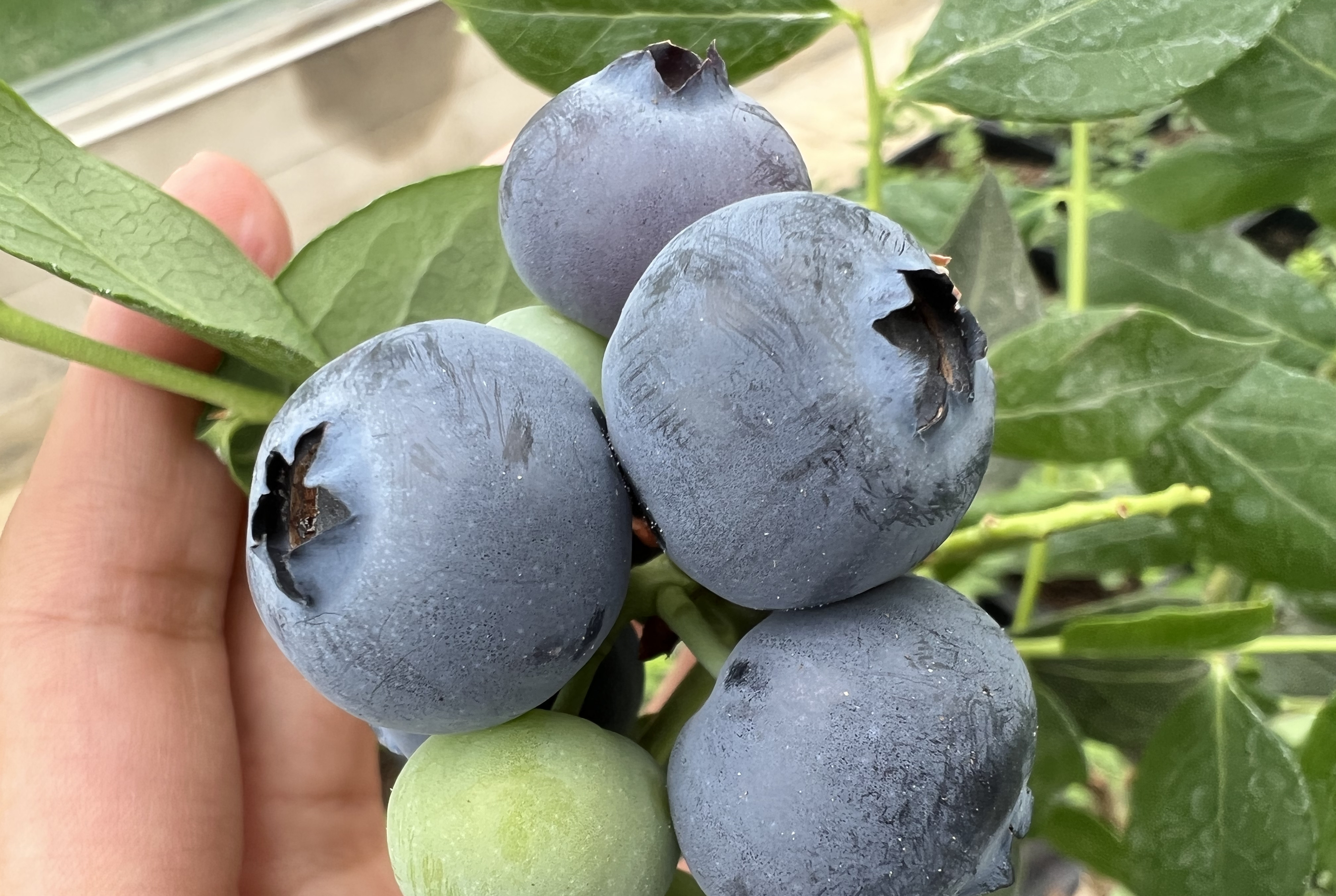 枝头成串的蓝莓黑珍珠般圆润新鲜,工人们随身带着装蓝莓的框子,手上是专用的指套,专挑黝黑成熟的蓝莓轻拿快放。大家说:“蓝莓外皮有果粉,要尽量减少触碰”。