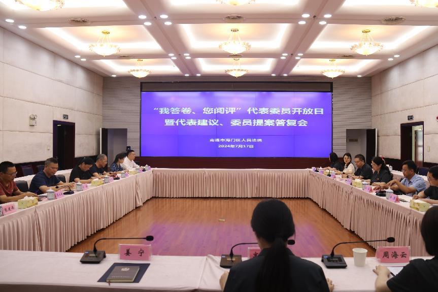 7月17日下午,海门法院召开“我答卷、你阅评”代表开放日暨代表建议、委员提案答复会,邀请代表委员面对面倾听交办建议提案的办理情况并提出意见建议。海门区人大常委会人事代表工委主任陆兵、区人大常委会人事代表工委副主任仇钰婷,区政协提案委副主任曹春华受邀参加活动,该院党组副书记、副院长黄燕,党组成员、副院长陈冲,党组成员、审判委员会专职委员徐德参加活动,活动由综合办公室主任马榕榕主持。