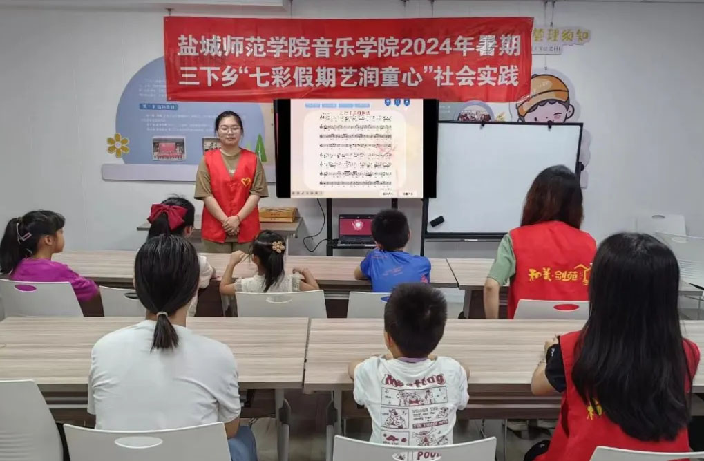 盐城师范学院的志愿者们正在开展音乐小课堂