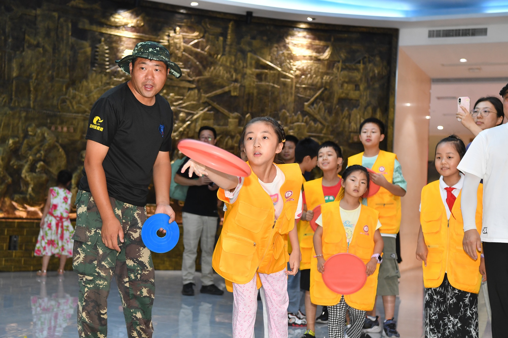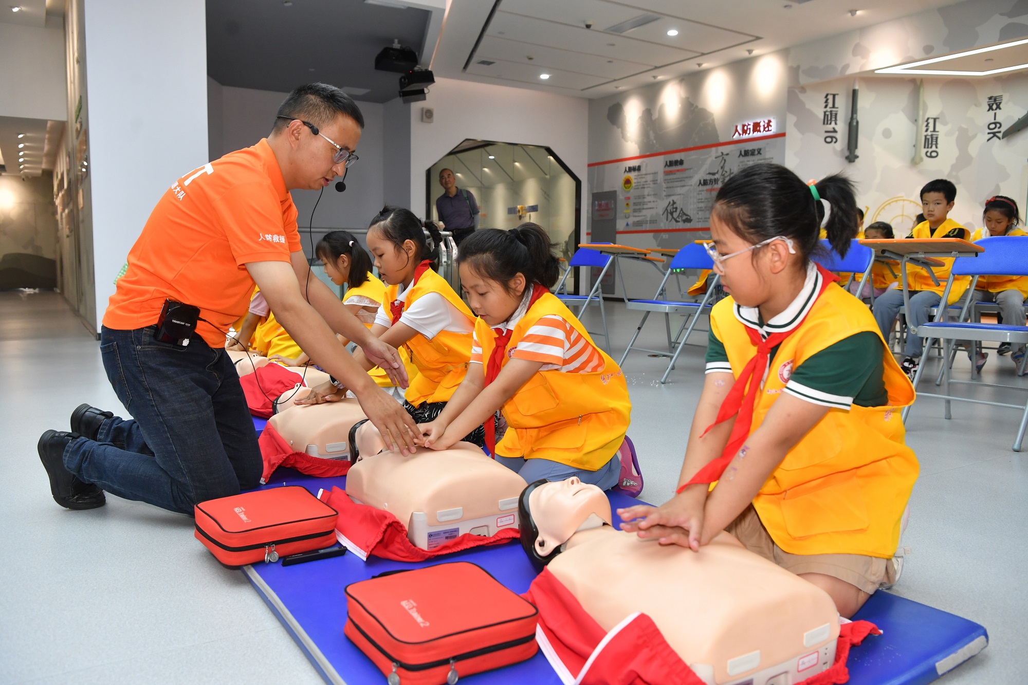 从防范高空坠物到溺水救援,从学习119虚拟报警系统到走进声光交互的地震体验展厅和科技感满满的VR体验厅,1个多小时的参观学习中,20多位中小学生在实操中了解应对空袭、应急突发事件的防护技能,上了一堂别开生面的国防教育课。随后,孩子们又在专业教官和人防应急救援队老师的指导下,陆续开展了室内拓展训练和急救课堂活动,通过飞盘运动释放双手、锻炼身体,借助训练模拟人学习心肺复苏和自动体外除颤器的使用。