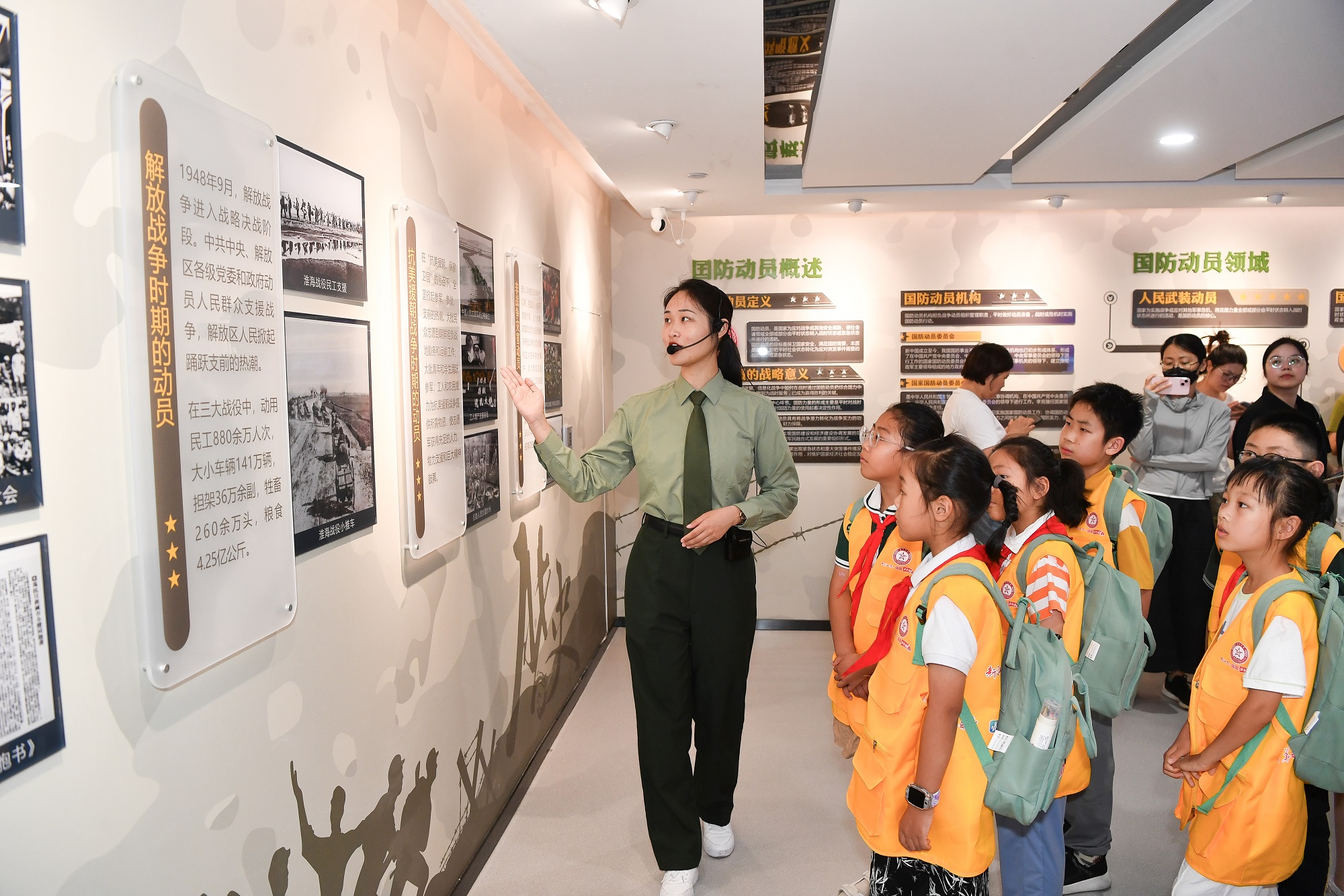 走进馆内,刻有中国人民防空标志的巨大浮雕墙映入眼帘,现代军事卫星、飞机、和平鸽和一组组人物群像融在其中,生动形象地展示了我国民防事业的发展。由序厅向内行进,讲解员向孩子们科普了世界范围内的空袭史和国防动员知识。伴随着文字、图片、影像等多媒体的呈现,百年来的世界历史浓缩为数个片段,孩子们在参观中学到了更多有关人民防空的知识,并近距离参观了轰-6K型轰炸机、歼-16战机、歼-20战机、东风-26远程弹道导弹和辽宁舰航母战斗群模型。
