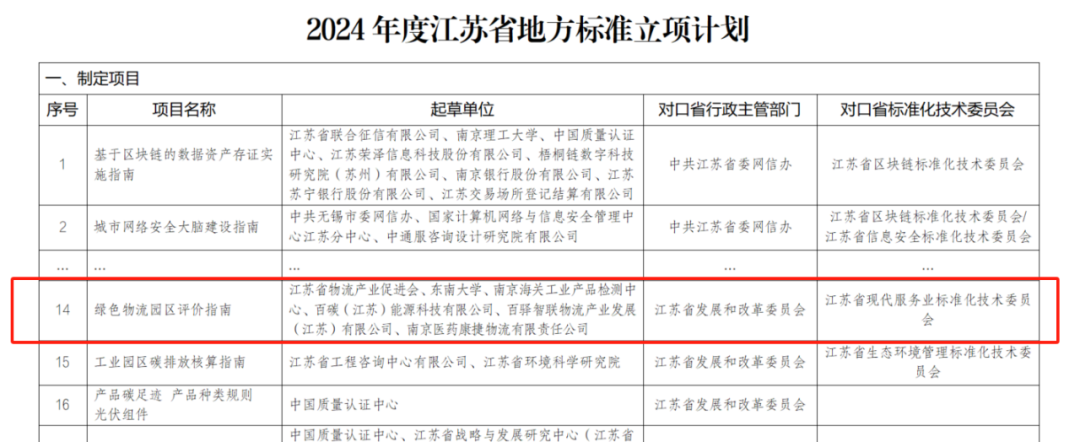 近日,由江苏省物流产业促进会主导申请的《绿色物流园区评价指南》成功获批立项。该标准联合东南大学、南京海关工业产品检测中心、百碳(江苏)能源科技有限公司等企事业单位共同开展编制工作。