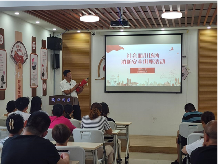 本次活动由社会面小场所消防安全负责人和部分居民参加,由社区物业刘经理授课,着重讲解“九小”场所违规住人、违规停放电动自行车或“飞线”充电、堵塞占用疏散通道和消防车通道等隐患对九小场所的弊端,以及灭火器材的使用方法。