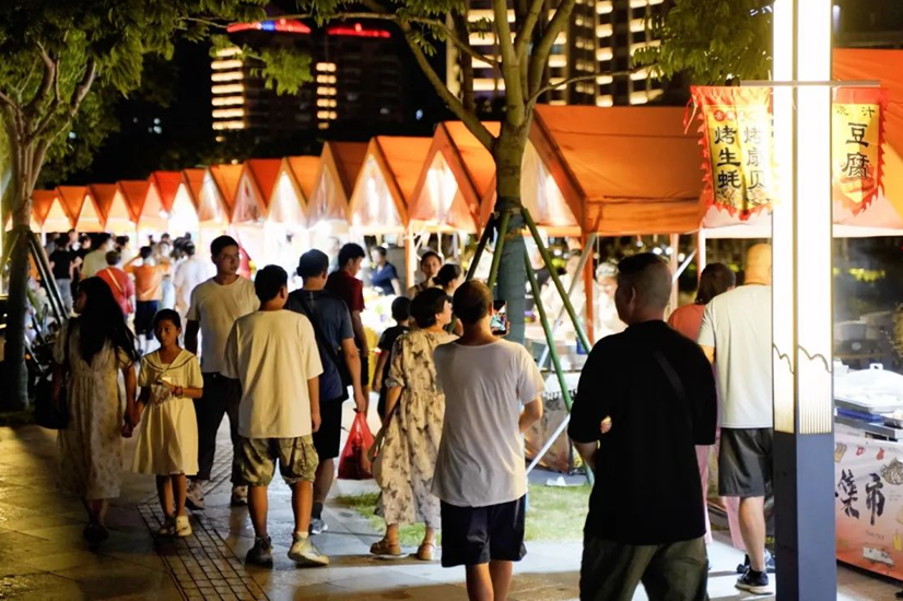 小山露营日落市集人头攒动,热闹非凡,各种小吃摊前围满了来广场上休闲娱乐的市民。