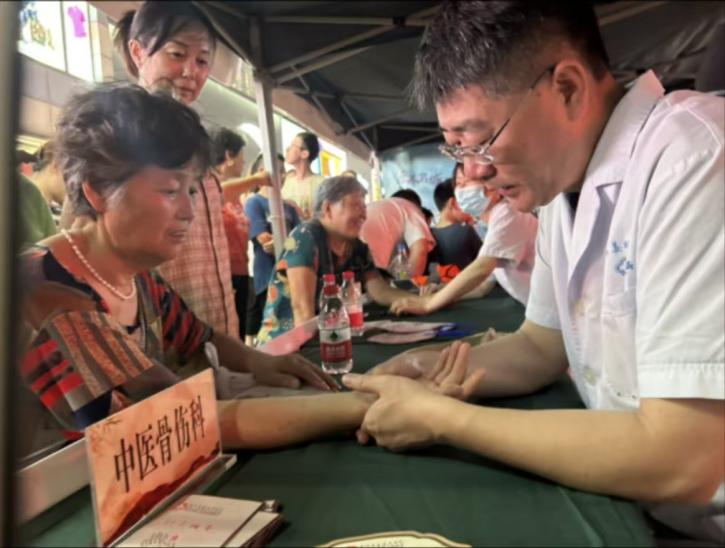 今年87岁的黄雨芳老奶奶,家住姜堰人民商场附近,17年前置换了股骨头,在和邻居闲聊时得知“中医药文化夜市”在家门口举办,她早早在中医骨科“摊位”前排队候诊。接诊的中医经典骨伤科主任、主任中医师钱文亮在细致询问检查后,提醒她特别要注意防止骨质疏松,注意防滑防跌。