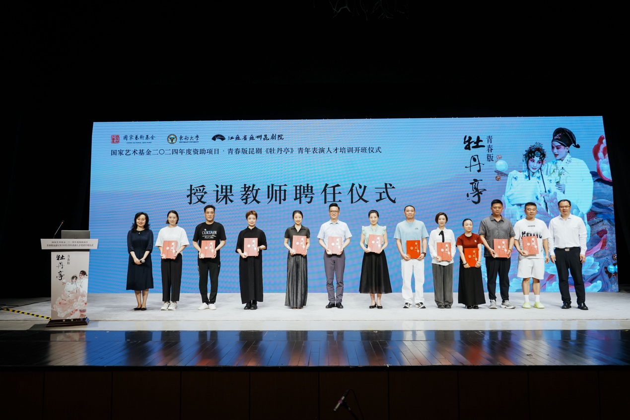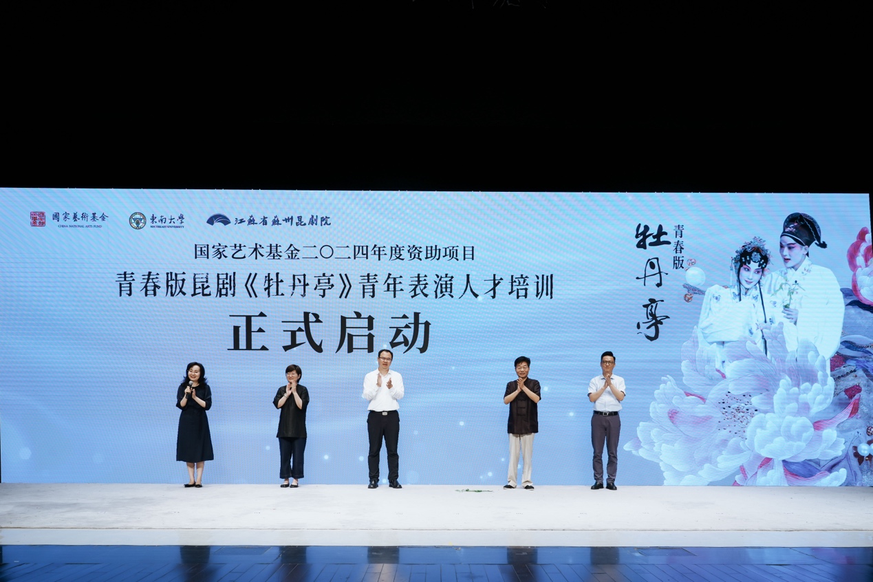 活动最后,东南大学副校长孙立涛,苏州市文广旅局副局长李红,苏州戏曲博物馆馆长、党支部书记、江苏省苏州昆剧院副院长俞玖林,江苏省苏州昆剧院原院长蔡少华,东南大学艺术学院党委书记赵天为一同上台,共同见证了本次青春版昆剧《牡丹亭》青年表演人才培训班项目正式启动。