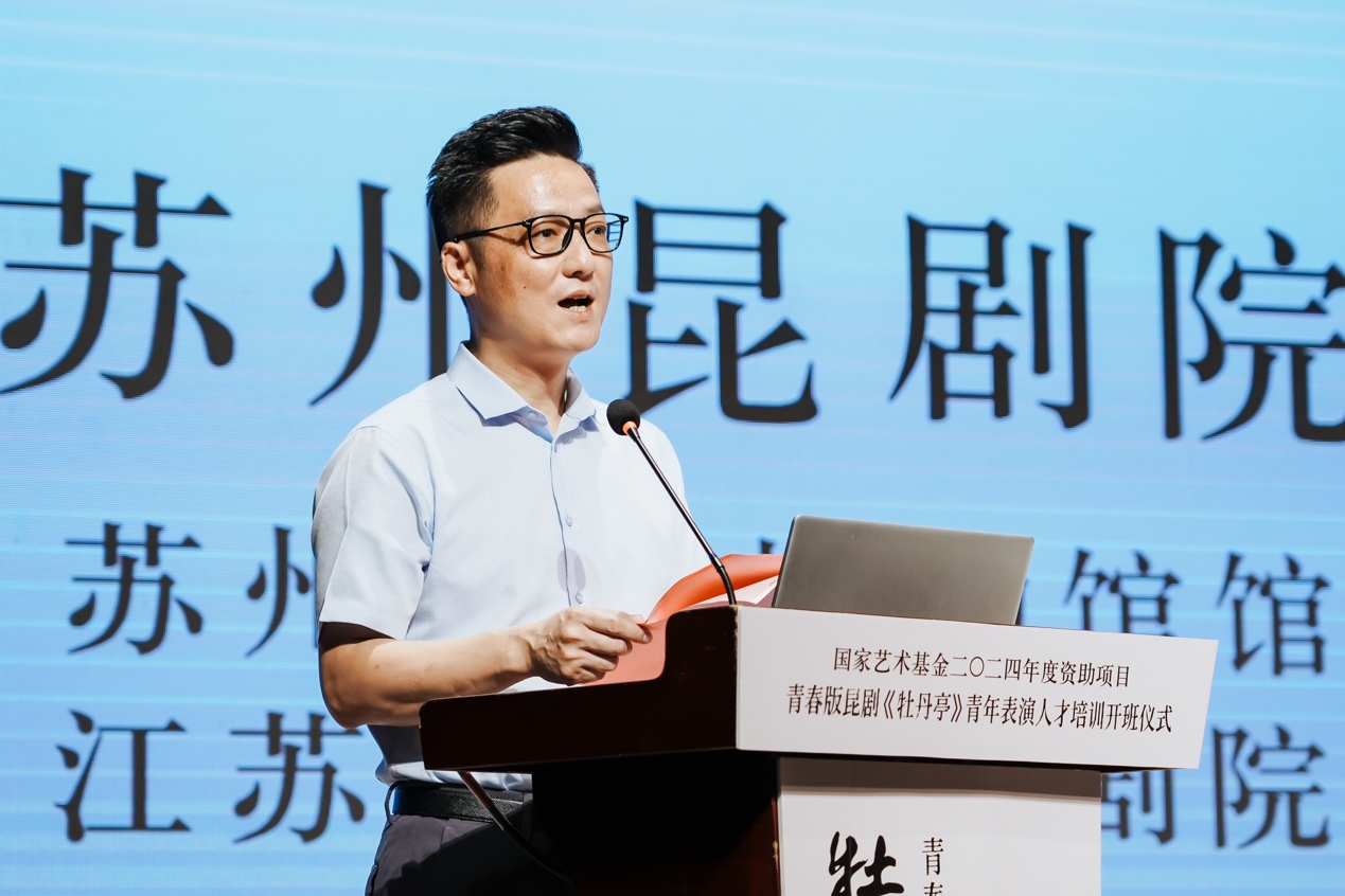 苏州戏曲博物馆馆长、党支部书记、江苏省苏州昆剧院副院长俞玖林,作为青春版《牡丹亭》中“柳梦梅”一角的扮演者,用20年的时光演绎人物的爱恨嗔痴,助力昆剧艺术在全世界十几个国家华丽绽放,更让无数观众感受到中国传统文化的魅力。他介绍到,苏州昆剧院一贯以抢救、继承传统昆剧为己任。建院60余年以来,相继培养“继、承、弘、扬、振”五代苏州昆剧人,制作排演经典大戏十多台,成功打造了多个青春版昆剧品牌项目,在昆剧界乃至文化界产生了广泛影响。他也期待学员们可以在接下来的培训过程中,演绎好这一部“校园青春版《牡丹亭》”,用青春与青春共鸣,让昆剧艺术生生不息。