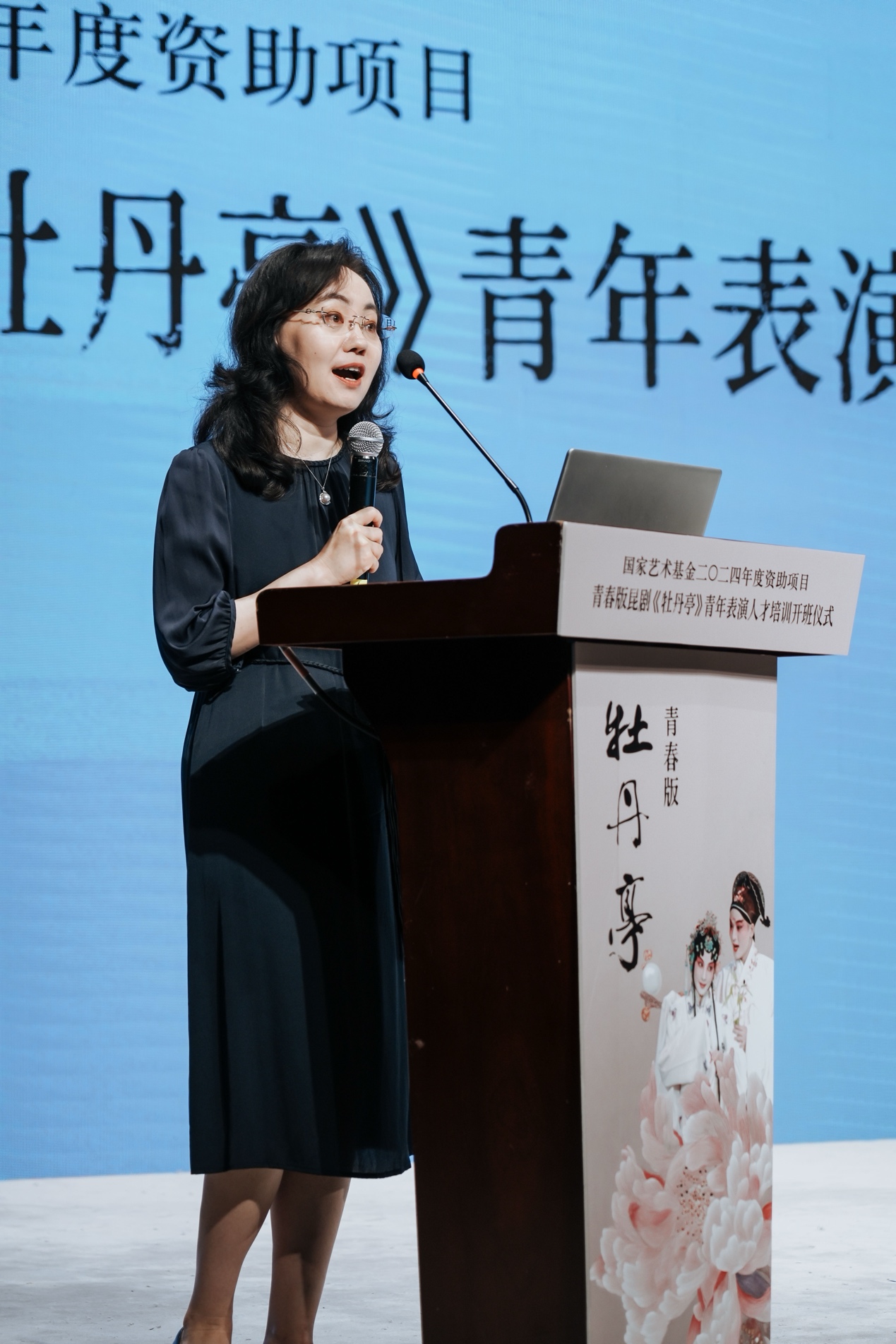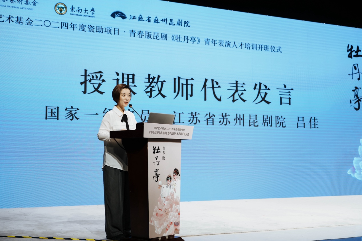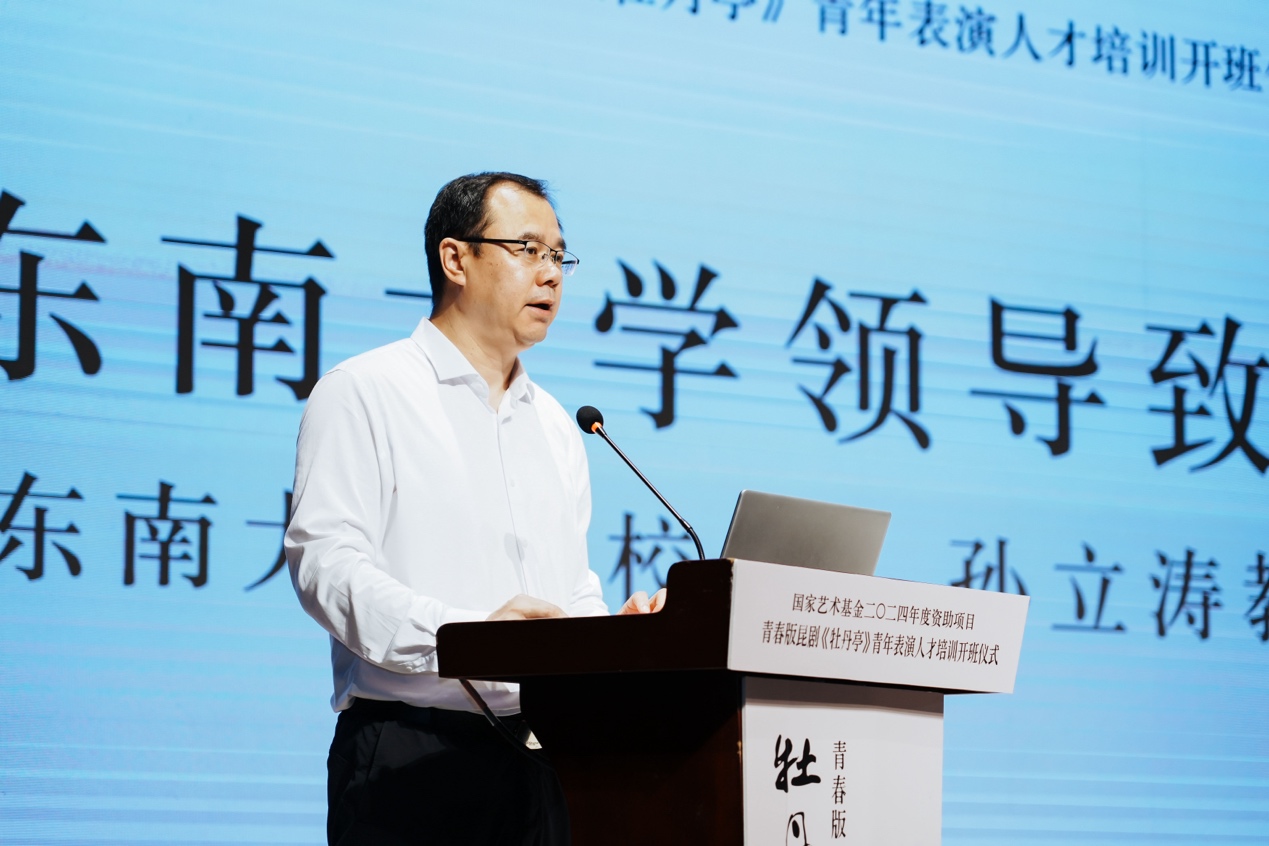 开班仪式上,东南大学副校长孙立涛致辞,他指出《青春版昆剧<牡丹亭>青年表演人才培训》是东南大学首项获得国家艺术基金资助项目,作为江苏省内仅有的五项艺术人才培训项目之一,标志着学校在艺术教育和创作领域翻开了新的篇章。他回顾了东南大学和昆曲的渊源,并对苏州昆剧院在本次项目中的辛苦付出表示了感谢,强调今后东南大学将进一步挖掘和整合昆剧艺术资源,培养更多优秀的青年表演人才,为昆剧艺术的传承与发展贡献高校力量。