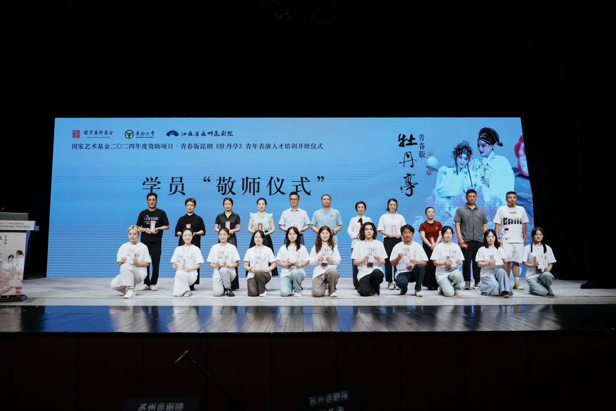 “敬师仪式”环节,此次参加培训项目的50名高校学员依次向授课老师们鞠躬,师生们以互赠“敬师卡”和“赠言卡”的形式表达了培训期间口传心授、勤学苦练的决心,以青春力量传播传统文化。据悉,这些学生来自中国戏曲学院、同济大学、上海戏剧学院、东南大学、南京艺术学院、澳门理工大学等7个省(直辖市、特别行政区)的29所高校,他们自幼热爱戏曲,有着多年的基本功训练。在培训班中,学员们将接受3个阶段的集中培训,集中学习70天后,学员将在结业仪式上进行2个小时的汇报演出,用所学技艺展示《牡丹亭》中的《游园》《惊梦》《言怀》《道觋》《离魂》《冥判》《忆女》《幽媾》《回生》九折小全本,以亲身体验传承昆剧艺术,坚定文化自信。