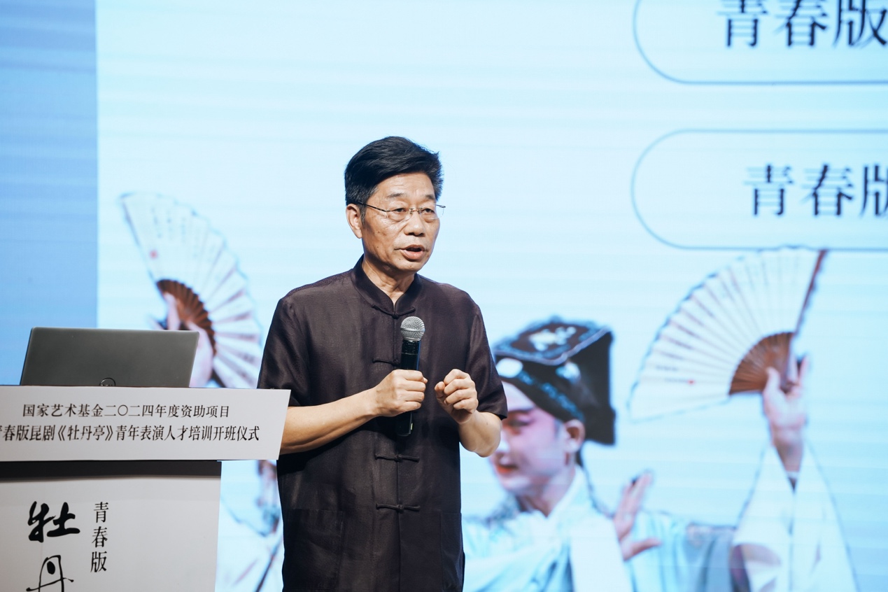 开班仪式的下半场,江苏省苏州昆剧院原院长蔡少华为全体学员带来了开班第一课《让古老的艺术焕发时代的青春——青春版<牡丹亭>回眸》,回顾了青春版《牡丹亭》20年的历程以及背后的故事,期望学员们以此为起点,承担起传承昆剧艺术的历史重任,让中国传统文化传唱全球。(聂茹欣)