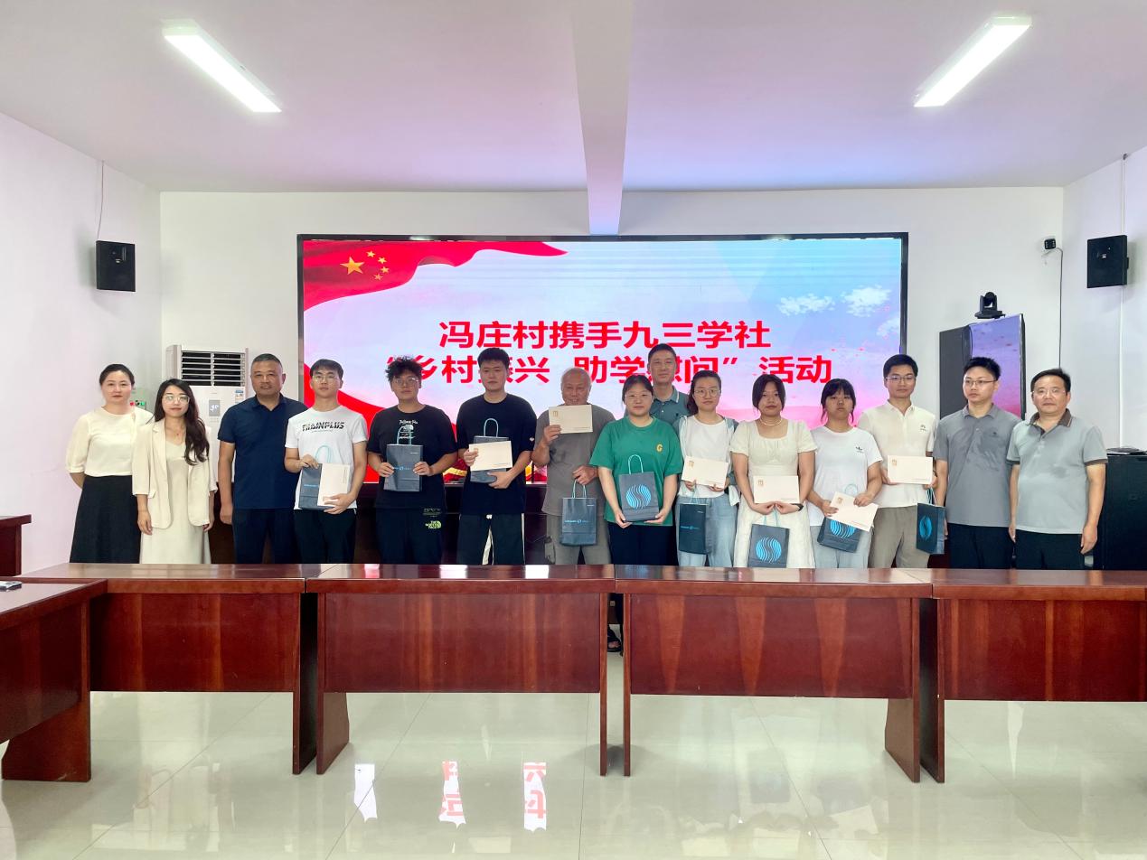 在冯庄村党群服务中心,九三学社姜堰区社会服务工委负责人与冯庄村负责人向该村9名准大学生捐赠助学资金及学习用品,希望他们认真学习,学成后投身家乡建设,助力乡村振兴事业发展。