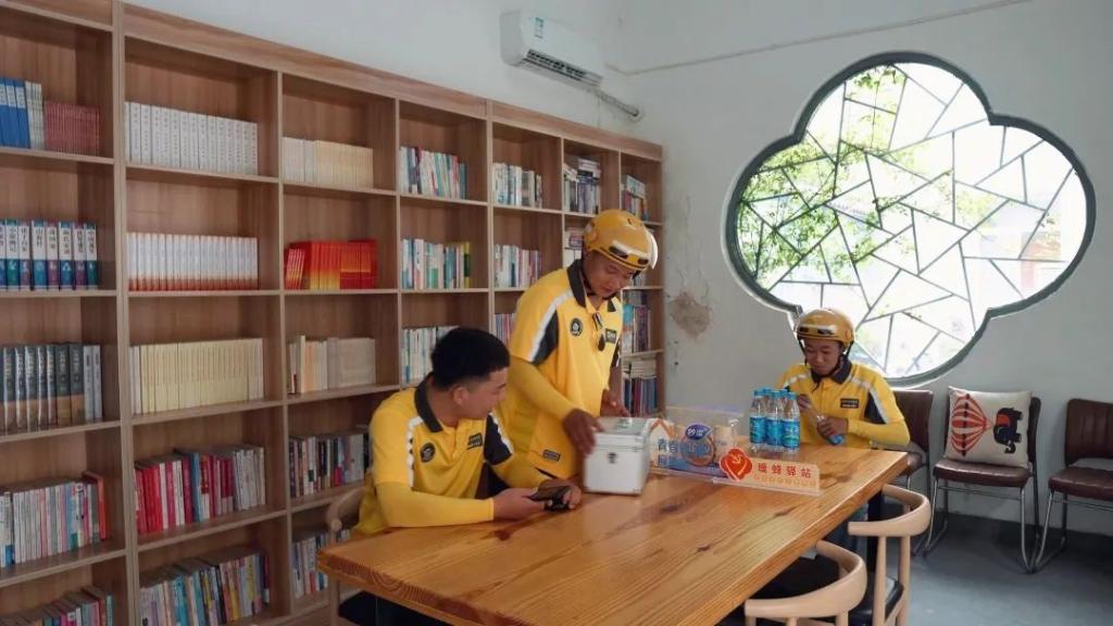 “天气太热了,饭点的订单多,我们来回奔波没时间喝水,手机没电了就进来吃个饭、给手机充充电,很方便。”外卖员李博豪说。烈日下,埭川社区的“暖蜂驿站”化身外卖骑手们的避暑胜地与能量补给站。站内不仅有座椅和空调,饮用水、应急药品及充电设备等也一应俱全。