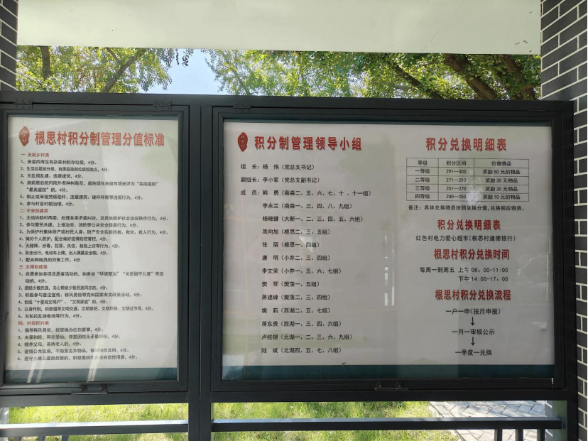 共议积分细则,“小积分”激发“大活力”。根思村成立积分制管理领导小组,在广泛征集村民意见的基础上,制定“佤家文明存折”《积分制试点建设实施方案》及《积分管理细则》,将美丽乡村、平安创建、文明创建、村规民约四大类23项工作纳入积分管理,明确积分兑换明细,设置积分兑换地点于红色村电力爱心超市,实行“一户一申(按月申报)、一月一审核公示、一季度一兑换”的积分兑换流程,将最终商定的积分细则上墙,让“佤家文明存折”积分制实施有章可循、有制可依、有据可查。“‘佤家文明存折’是我们文明行为的‘指南针’!”根思村村民李冬兰说。