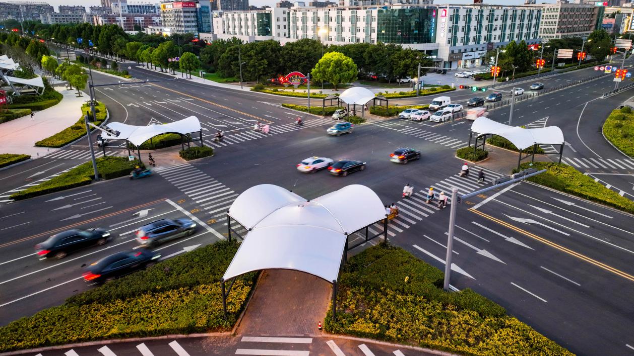 为进一步体现“以人为本”的城市建设服务理念,更好地服务出行市民,自觉减少停车越线、抢道乱行现象,积极营造文明出行、畅通有序舒适的交通环境。灌南县城发集团结合实际情况,组织专业人员对中心城区主要道路路口进行实地调研、踩点勘察,了解掌握重要道路路口车流、人流密度、流量及红绿灯信号等待时长等情况,通过召开会议、多方探讨,科学选取中心城区主要道路十字路口及学校周边,投资290万元,建设安装54座便民遮阳棚设施,其中县政府东侧人民路与迎宾南路交叉路口4座,主体由立柱、支架、张拉膜组成,将整个渠化岛待行区全部覆盖。其余交通路口50座,材质主体为钢结构,顶面采用PVDF膜材,白色的遮阳棚造型简约现代,兼具美观性和实用性。