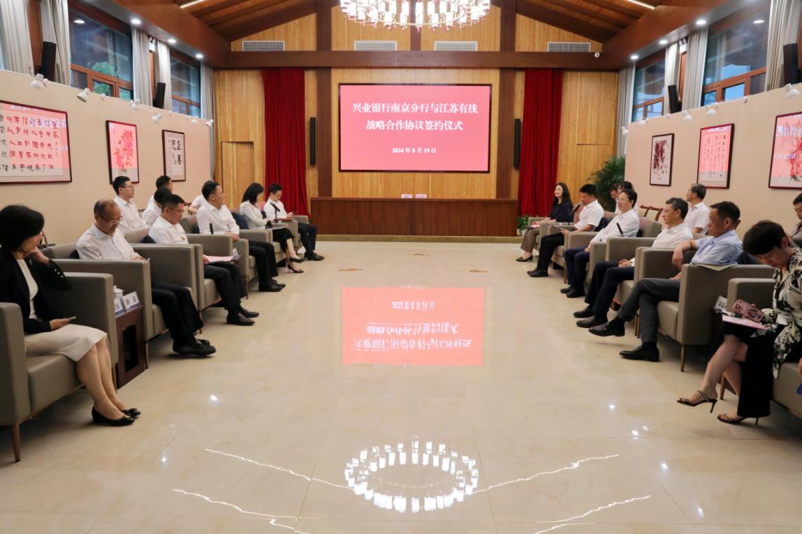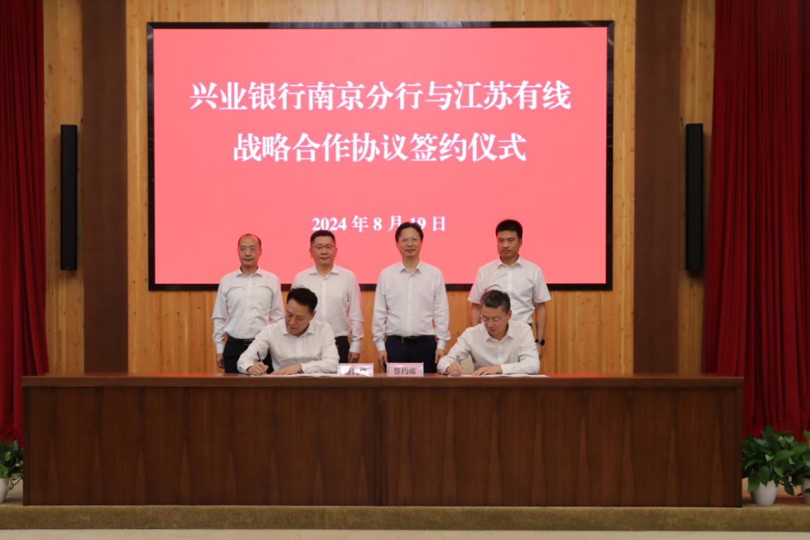 8月19日,兴业银行南京分行与江苏有线战略合作签约仪式在江苏有线三网融合枢纽中心举行。兴业银行南京分行党委书记、行长叶向峰,江苏有线党委书记、董事长庄传伟出席签约仪式并致辞。兴业银行南京分行党委委员、副行长黄立峰,江苏有线党委委员、总会计师王展分别代表双方签订合作协议。