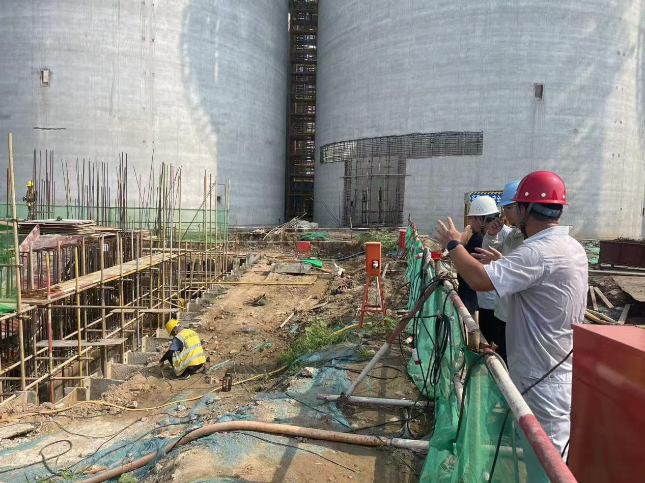 在浅圆仓项目滑膜施工现场,建仓负责人员深入一线,保证项目顺利推进。