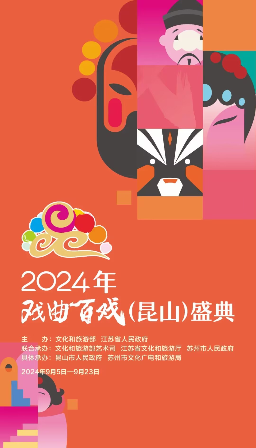 2024年戏曲百戏(昆山)盛典由文化和旅游部、江苏省人民政府主办,文化和旅游部艺术司、江苏省文化和旅游厅、苏州市人民政府联合承办,昆山市人民政府、苏州市文化广电和旅游局具体承办。以“戏曲的盛会 百姓的节日”为主题。今年的百戏盛典共安排四大主体活动和四项延伸活动。四大主体活动包括开闭幕式、全国戏曲演员会演(净行、丑行)、全国戏曲表演领军人才培养计划入选人员优秀剧目邀请展演、“天下第一团”戏曲音乐创作传习班;四项延伸活动包括“看百戏、游江苏”戏曲之旅、戏曲百戏博物馆主题展、百戏国潮嘉年华、戏曲对话等。期间安排21场折子戏组台,5场大戏,可谓精彩纷呈。